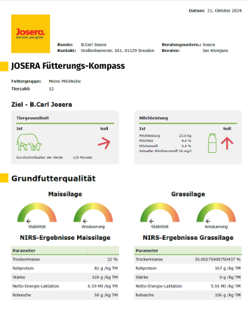 Grundfutter ist die Basis - und es schwankt. Der JOSERA Fütterungs-Kompass macht Unterschiede zwischen Silopartien oder Silo-Schichten sichtbar (z. B. Trockenmasse, Faser, Energie).