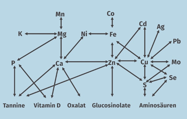 Eine noch größere Bedeutung hat aber die richtige Dosierung. Was nützt es, über die Ausstattung zu diskutieren, wenn die vom Tier benötigten Mengen nicht verabreicht werden? Das kniffelige hierbei sind die Wechselwirkungen der Elemente untereinander (siehe Grafik).