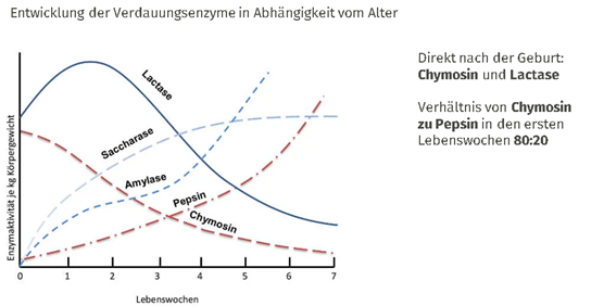 Das Verdauungsenzymsystem des Kalbes ist nach der Geburt auf die Zusammensetzung der Vollmilch eingestellt.