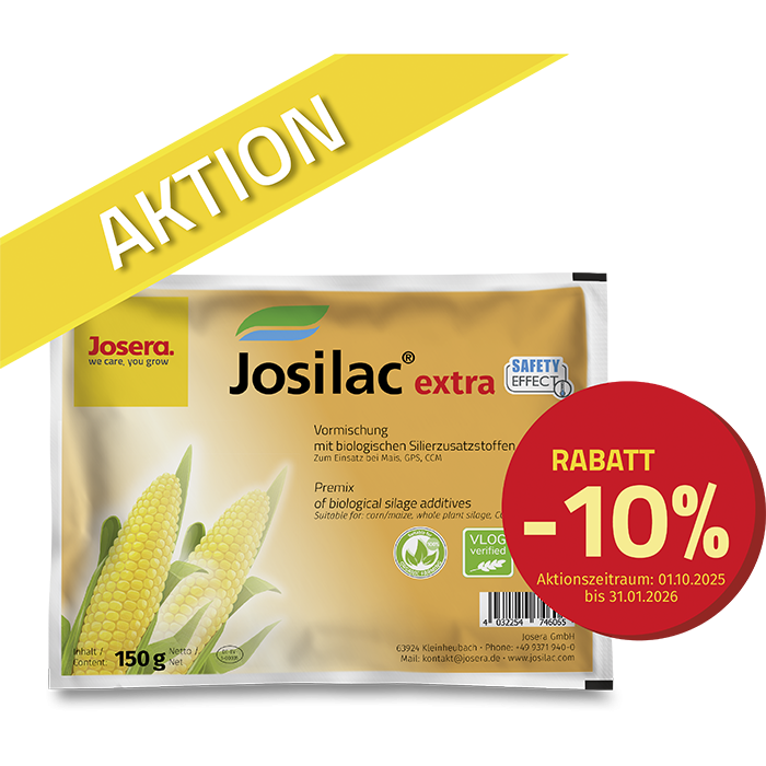Die in Josilac® extra enthaltenen heterofermentativen Milchsäurebakterien wandeln die primär gebildete Milchsäure teilweise in Essigsäure und 1,2- Propandiol um. Dadurch wird das Siliergut sehr effektiv konserviert und ist vor Nacherwärmung gut geschützt. So bleibt die Silage nach Luftzufuhr länger kühl und frisch (hohe aerobe Stabilität). Durch eine vergleichsweise hohe Osmotoleranz der Bakterienstämme ist die Wirksamkeit von Josilac® extra auch bei sehr trockenem Siliergut sichergestellt.