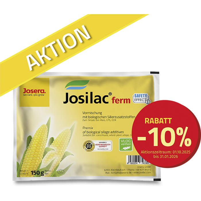 Die in Josilac®ferm enthaltenen heterofermentativen Milchsäurebakterien wandeln zuvor gebildete Milchsäure teilweise in Essigsäure und 1,2- Propandiol um. So wird das Siliergut effektiv konserviert und ist vor Nacherwärmung geschützt. Die Silagen bleiben nach Luftzufuhr länger stabil (hohe aerobe Stabilität). Durch die hohe Osmotoleranz der Bakterienstämme ist die Wirksamkeit auch bei Siliergut mit TS-Gehalten bis 60% sichergestellt.