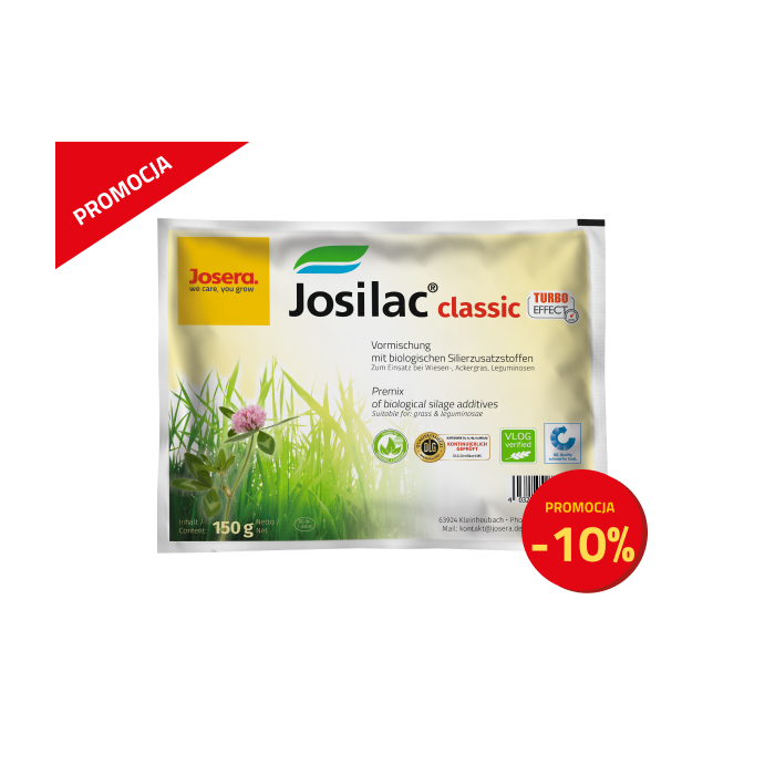 Zakiszacz bakteryjny Josilac Classic jest biologicznym konserwantem do kiszonek o bardzo wysokiej koncentracji homofermentatywnych bakterii kwasu mlekowego oraz skutecznych enzymów. Jest to produkt klasy premium ze specjalną formułą TURBO-effect, dzięki której można uzyskać najlepszą jakość kiszonki, przygotowanej nawet w trudnych warunkach. Zastosowana w preparacie formuła przyspiesza fermentację kwasu mlekowego w świeżej kiszonce, natomiast negatywne procesy towarzyszące, które mogą mieć wpływ na jakość kiszonki są efektywnie redukowane, co zapobiega procesowi niewłaściwej fermentacji. Ponadto TURBO-Effect zapewnia stabilizację białek w kiszonce. Ogranicza to degradację białek podczas kiszenia oraz zmniejsza w kiszonce zawartość amoniaku, co w konsekwencji zwiększa udział białka chronionego (UDP). TURBO-effect jest wspierany dodatkowo poprzez enzymy uwalniające ze ścian komórkowych roślin cukry, które dzięki temu zwiększają pulę cennych substratów do fermentacji. Co najważniejsze zabezpieczony w ten sposób proces prawidłowej fermentacji jest możliwy nawet w trudnych warunkach takich jak na przykład: deszczowa pogoda, niska zawartość cukru, czy też wysoka pojemność buforowa. Preparat zaleca się do przygotowania kiszonek z traw, koniczyny, lucerny i innych roślin motylkowych. Zakiszacz bakteryjny Josilac Classic cechuje duża elastyczność stosowania, łatwość aplikacji oraz wysoka skuteczność.